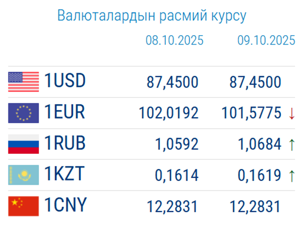 Улуттук банктын маалыматына караганда бүгүн, 9-октябрга карата чет өлкө валюталарынын курсу төмөндөгүдөй болуп аныкталды: