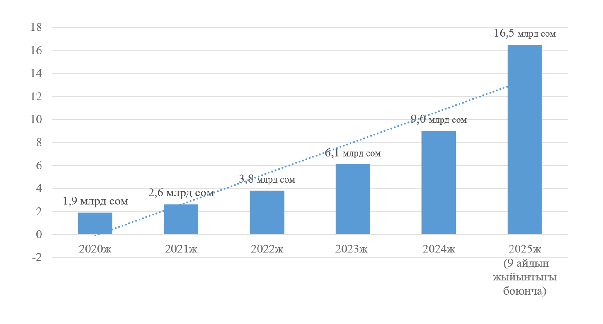 Акыркы 6 жылдагы каржылоо портфелинин динамикасы төмөнкү графикте көрсөтүлгөн. Ислам каржылоо продуктарына суроо-талаптын жылдан-жылга өсүп жаткандыгына байланыштуу, графикте каржылоо портфелинин өсүү динамикаcын байкаса болот. Айтсак, 2020-жылдын жыйынтыгы боюнча - 1,9 млрд сомго барабар болгон болсо, быйыл 2025-жылдын 9 айынын жыйынтыгы менен эле - 16,5 млрд сомду түздү.