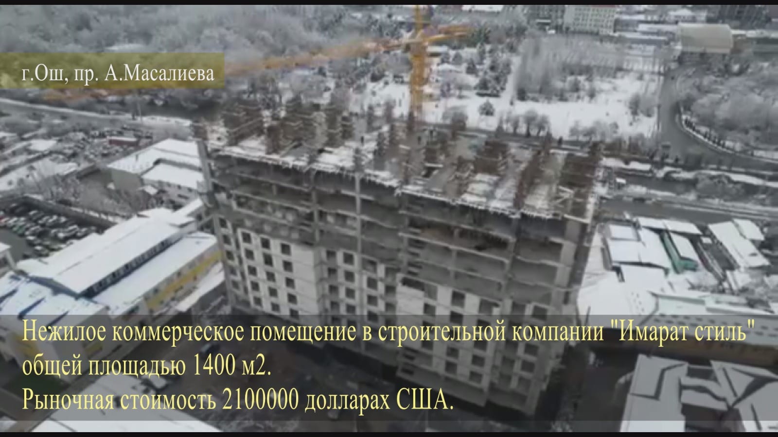 · Ош шаарынын А.Масалиев көчөсүндө жайгашкан «Имарат Стиль» ЖЧКсына тиешелүү «ИМПЕРИАЛ» турак жай эмес коммерциялык имараты, жалпы аянты 1400 чарчы метр, болжолдуу баасы 2 млн. 100 миң АКШ долларын түзөт.