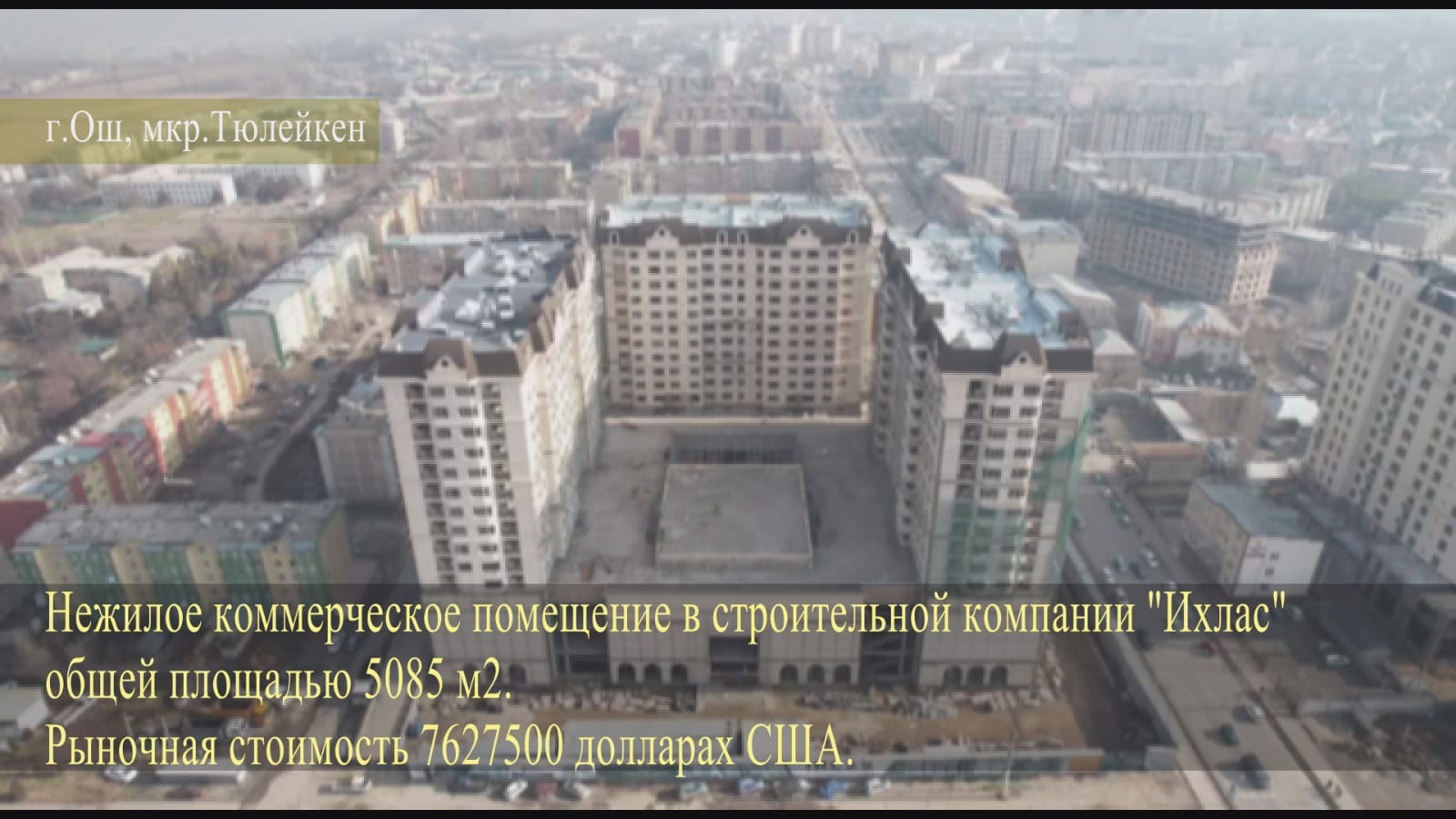 · Ош шаарындагы Төлөйкөн кичирайонунда жайгашкан «Ихлас» курулуш компаниясынын турак эмес, коммерциялык имараттары, жалпы аянты 5085 чарчы метр, алдын ала баасы 7 млн 627 миң АКШ долларын түзөт;