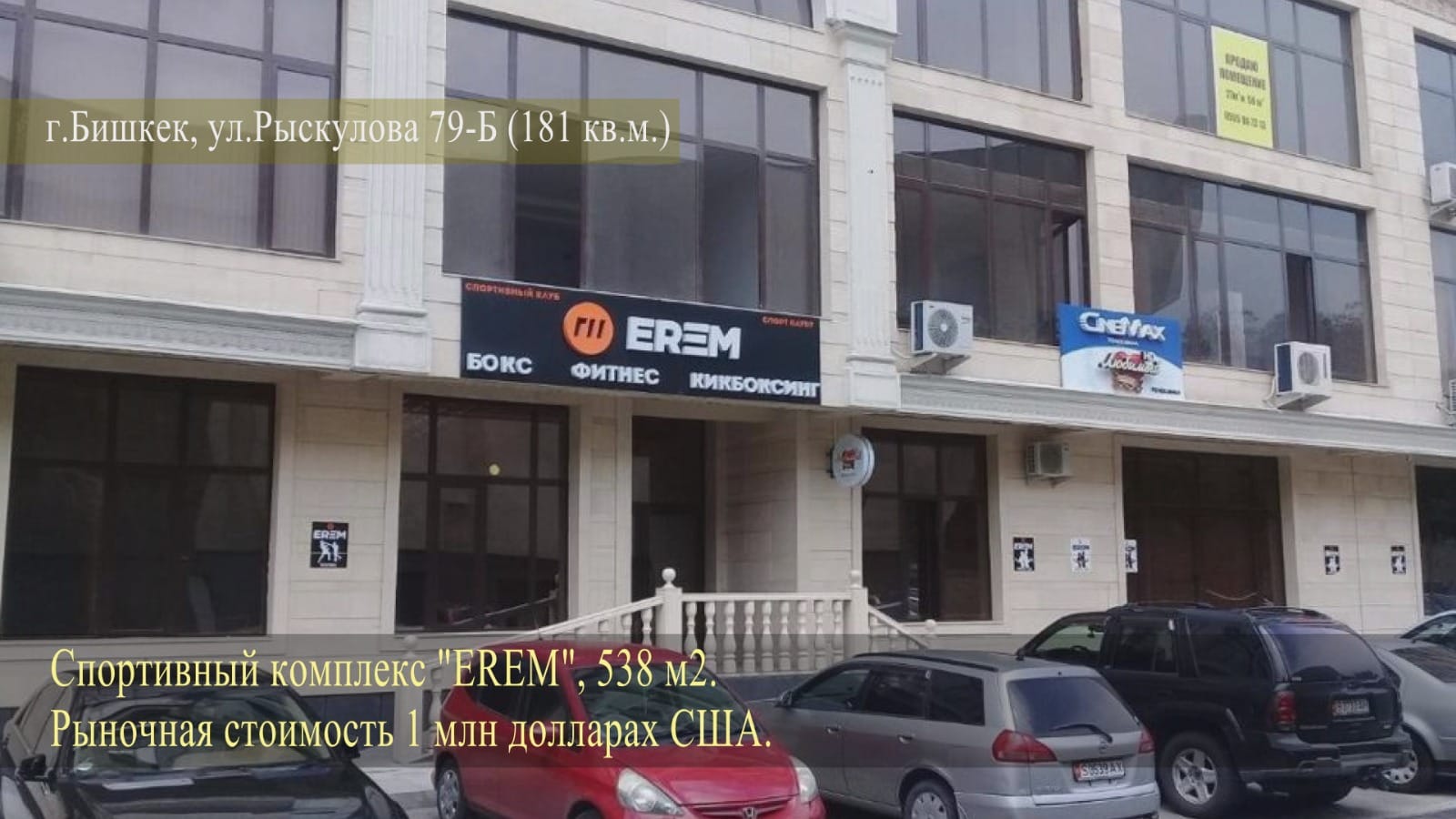 · Бишкек шаарынын Рыскулов көчөсүнүн 79 Б дарегинде жайгашкан «Эрем» спорт клубу, жалпы аянты 538 чарчы метр, болжолдуу баасы 1 млн АКШ доллары;