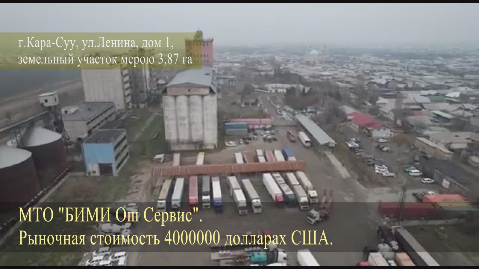 · Ош облусунун Кара-Суу районунун аймагындагы 3,87 га жер тилкеси менен «БИМИ Ош сервис» БКЖ (бажылык каттоо жери) алдын ала баасы 4 млн. АКШ долларын түзөт;