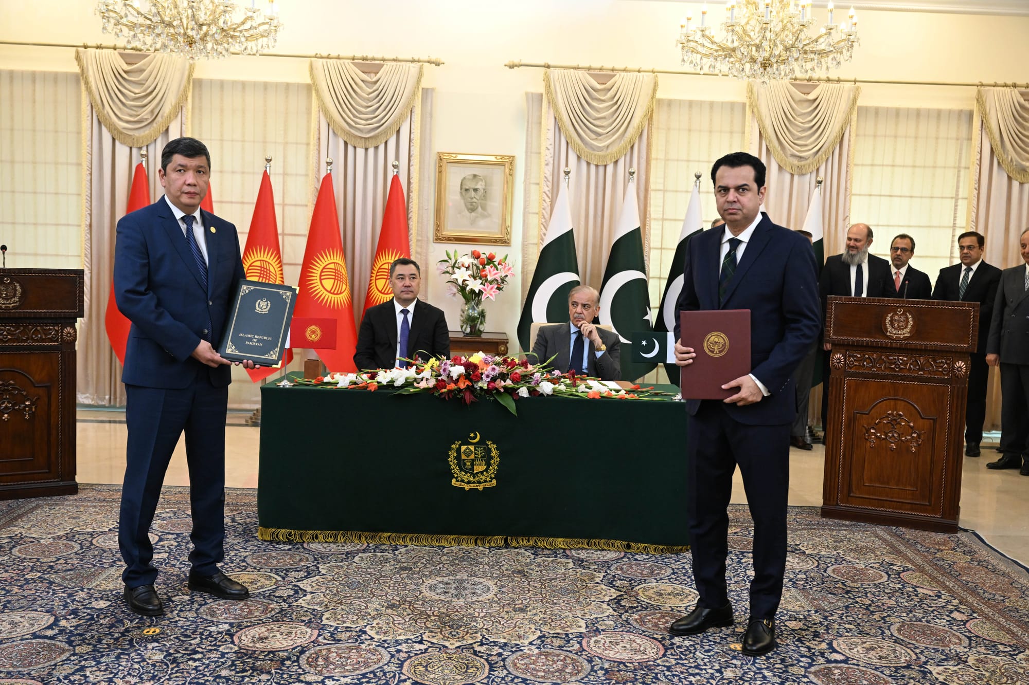Президент Садыр Жапаровдун Пакистан Ислам Республикасына болгон мамлекеттик сапарынын алкагында экономика, деңиз портторун пайдалануу, билим берүү, саламаттыкты сактоо, маданият, айыл чарба, туризм, энергетика, юстиция жана укуктук маселелер тармактарында кызматташтыкты кеңейтүү жаатында бир катар документтерге кол коюлду.