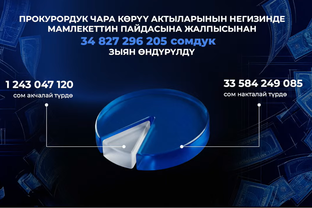 Ошондой эле миңдеген кызмат адамдары жоопкерчиликке тартылып, айып пулдар салынган. Прокурордук чаралардын негизинде мамлекеттин пайдасына жалпысынан 34,8 млрд сомдон ашык зыян өндүрүлүп берилген.