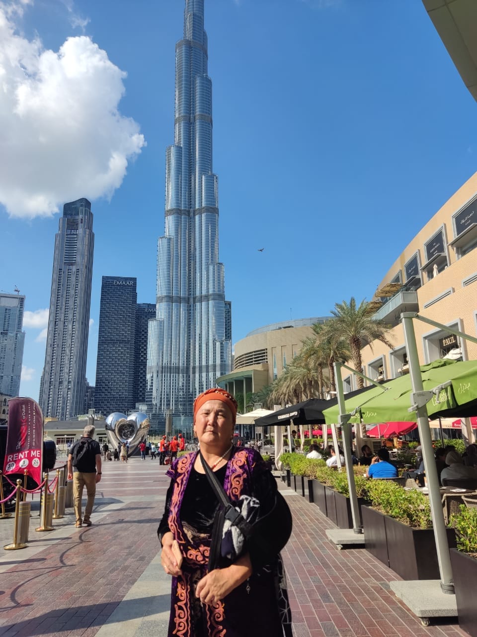 Августта аларды коштоп жүргөн кыргыз бала чалып: “Апа баягы арабдар сизди каттама жасаганды үйрөтсүнчү деп суранып жатышат”,-дейт. “Келсин бул жакка үйрөтөйүн”, десем: “Жоок, сиз Арабияга барып үйрөтүшүңүз керек экен”,-дейт. Өмүрү бир жакка чыгып көрбөгөн жаным, “Көрөйүн балам, үй-бүлөм менен кеңешейин. Мен мынабу Ошту көрө элекмин керек болсо”,- дедим. Антип-минткиче убакыт өттү. Тиги бала октябрда кайра чалып: “Апа арабдар суранып жатышат, барып бербейсизби”,-деди. Колум ооруп, ооруканада болгондуктан, “Жакшы болгондо барайын”, деп коюп кайра унутуп калыпмын. Декабрь айында тиги бала кайра чалып, дагы суранды. Анан ага жалгыз бара албасымды айтып: “Жаныма бир кызымды, анан бир эркек киши ала барсам болобу?”,-десем, “Тигилерден сурап көрөйүн”, деп калды. Көп өтпөй эле тигилер 3 кишиге билет алып берип 9-декабрда учтук. Тиги бала бизди бул жактан салып, Абу-Дабиден арабдар өздөрү тосуп алышты. 10 күн ошол жакта болуп, Абу-Дабини кыдырып, Ак Мечитке чейин бардык.