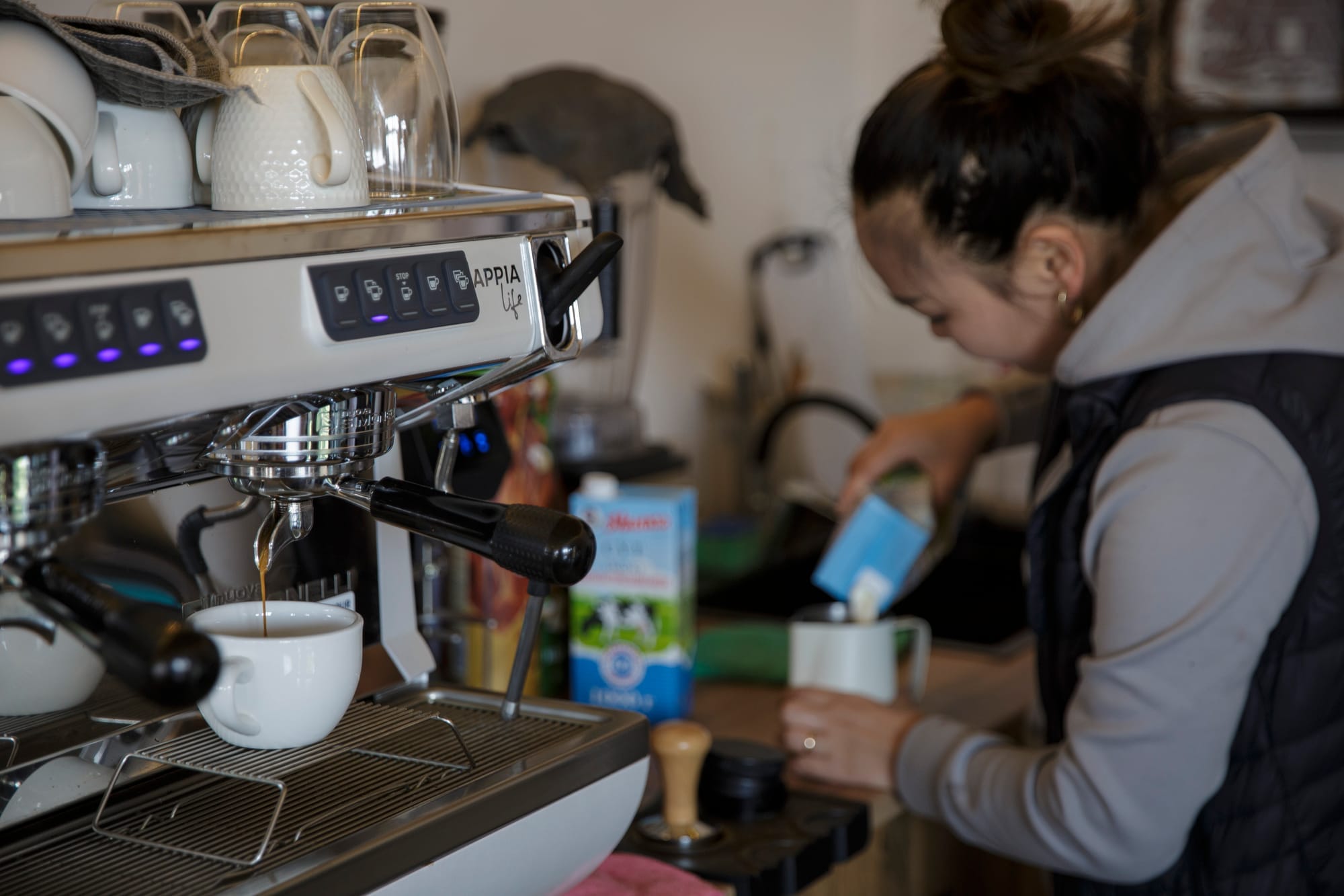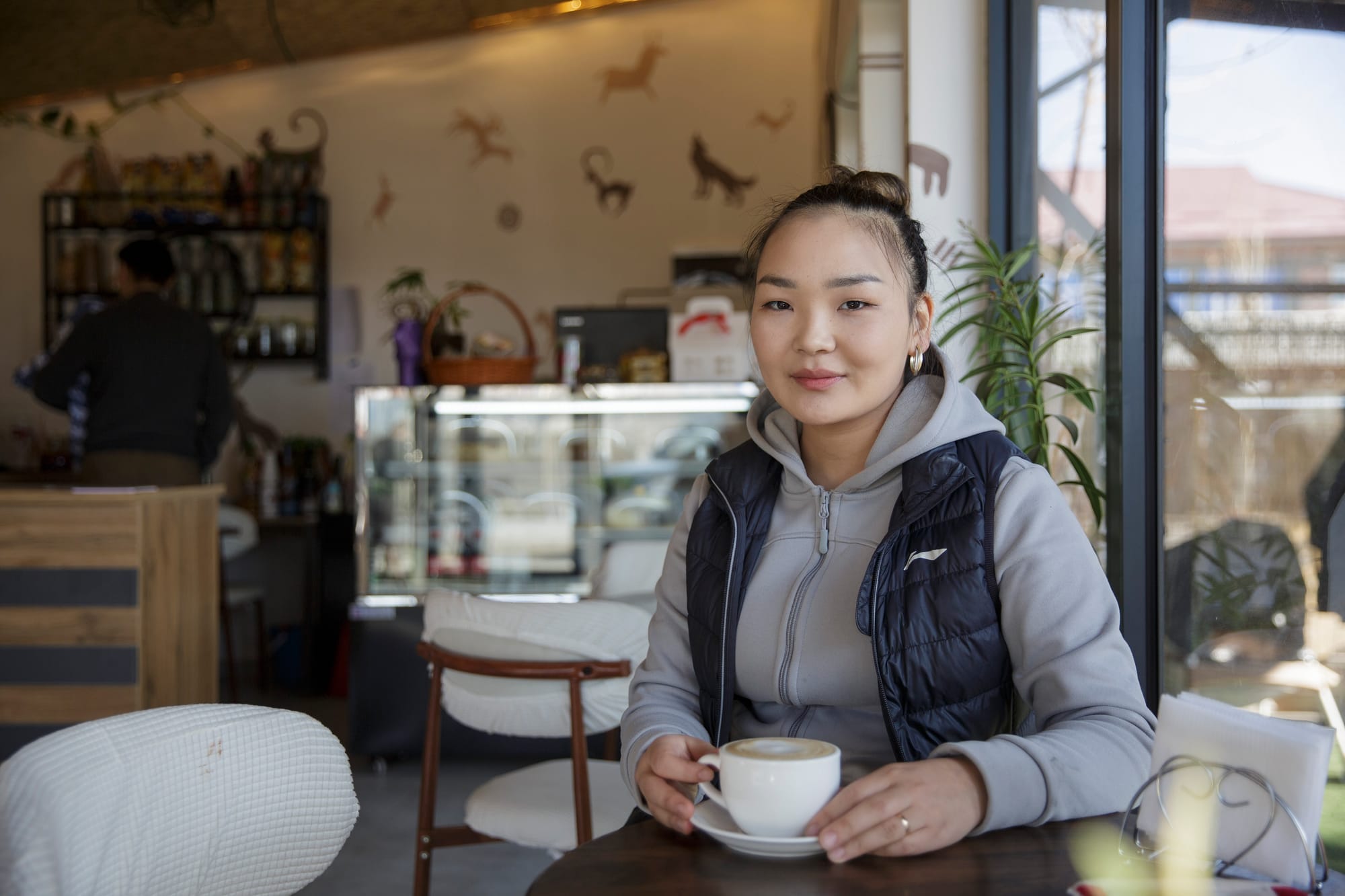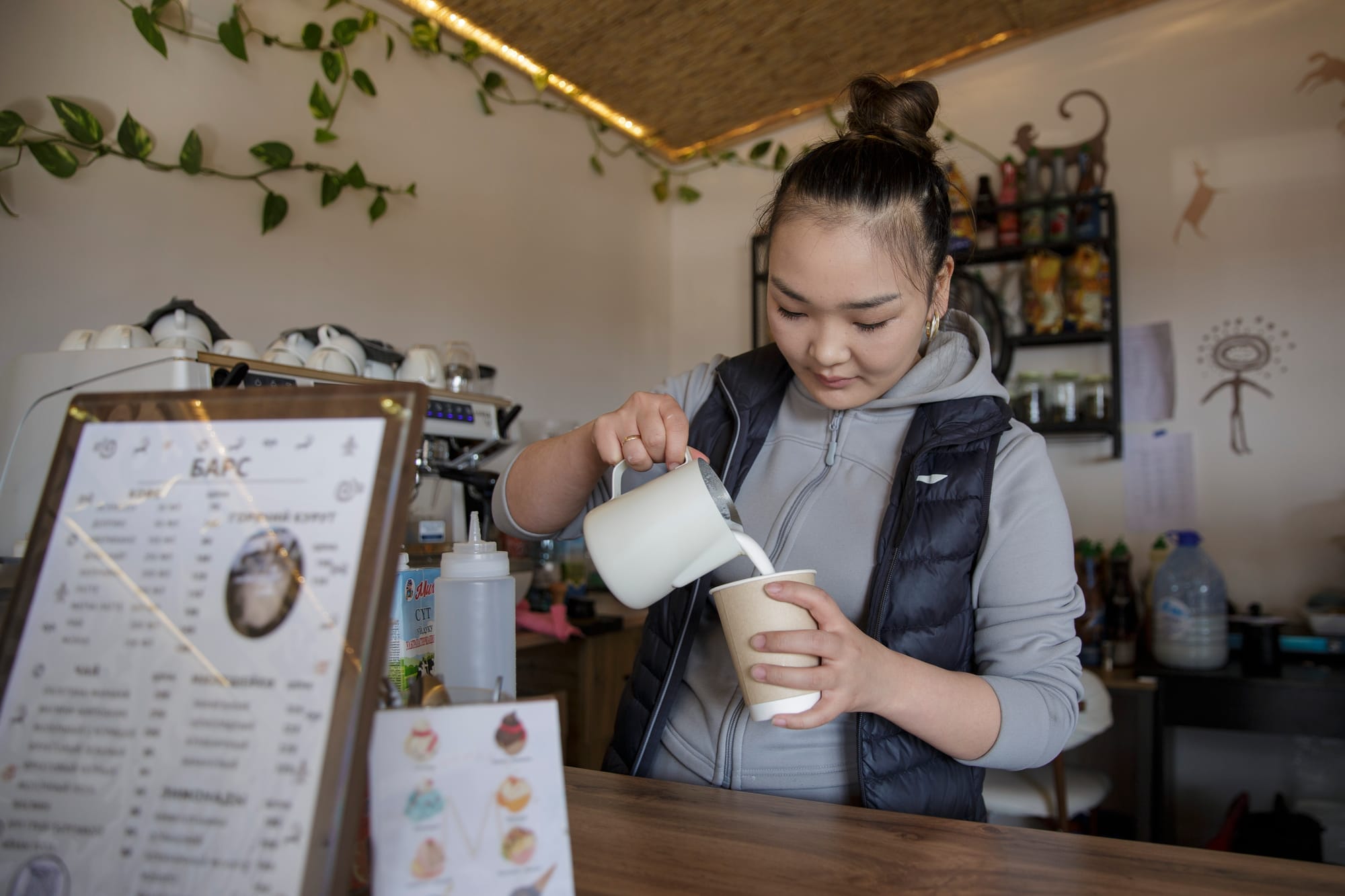 Жасмина декреттик өргүүдө жүрүп маал-маалы менен кофеканада Кудайбердинин ордун басып турат. Сүрөт: Эл аралык миграция уюму (ЭМУ).