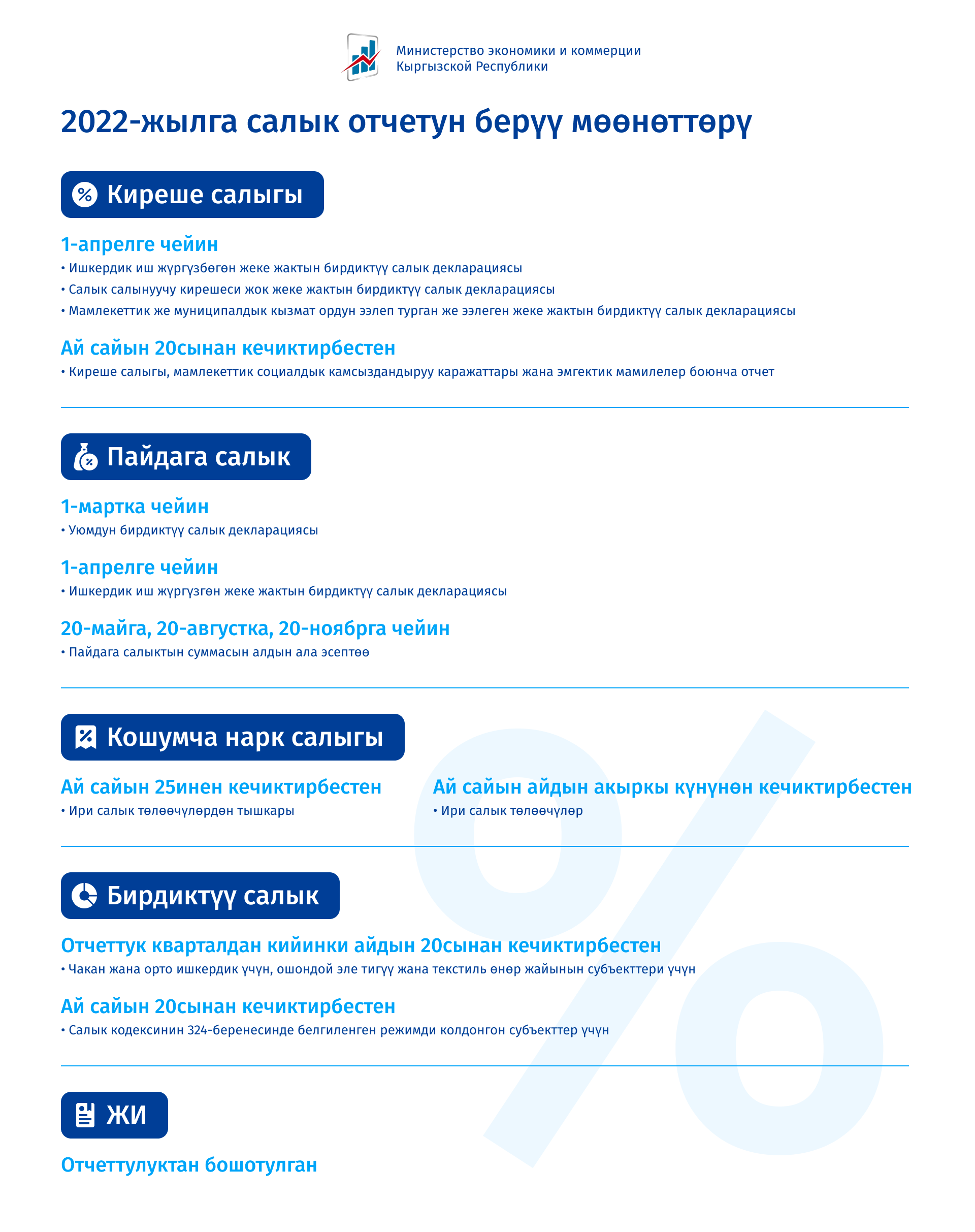 Бардык салык төлөөчүлөр, анын ичинде чакан жана орто бизнес жана коммерциялык эмес уюмдар киреше салыгы жана мамлекеттик социалдык камсыздандыруу фонддору боюнча отчётторду 2022-жылдын 1-январынан тартып киреше төлөнгөн айдан кийинки айдын 20сынан кечиктирбестен бирдиктүү FORM STI-161 формасында ай сайын тапшырууга милдеттүү.