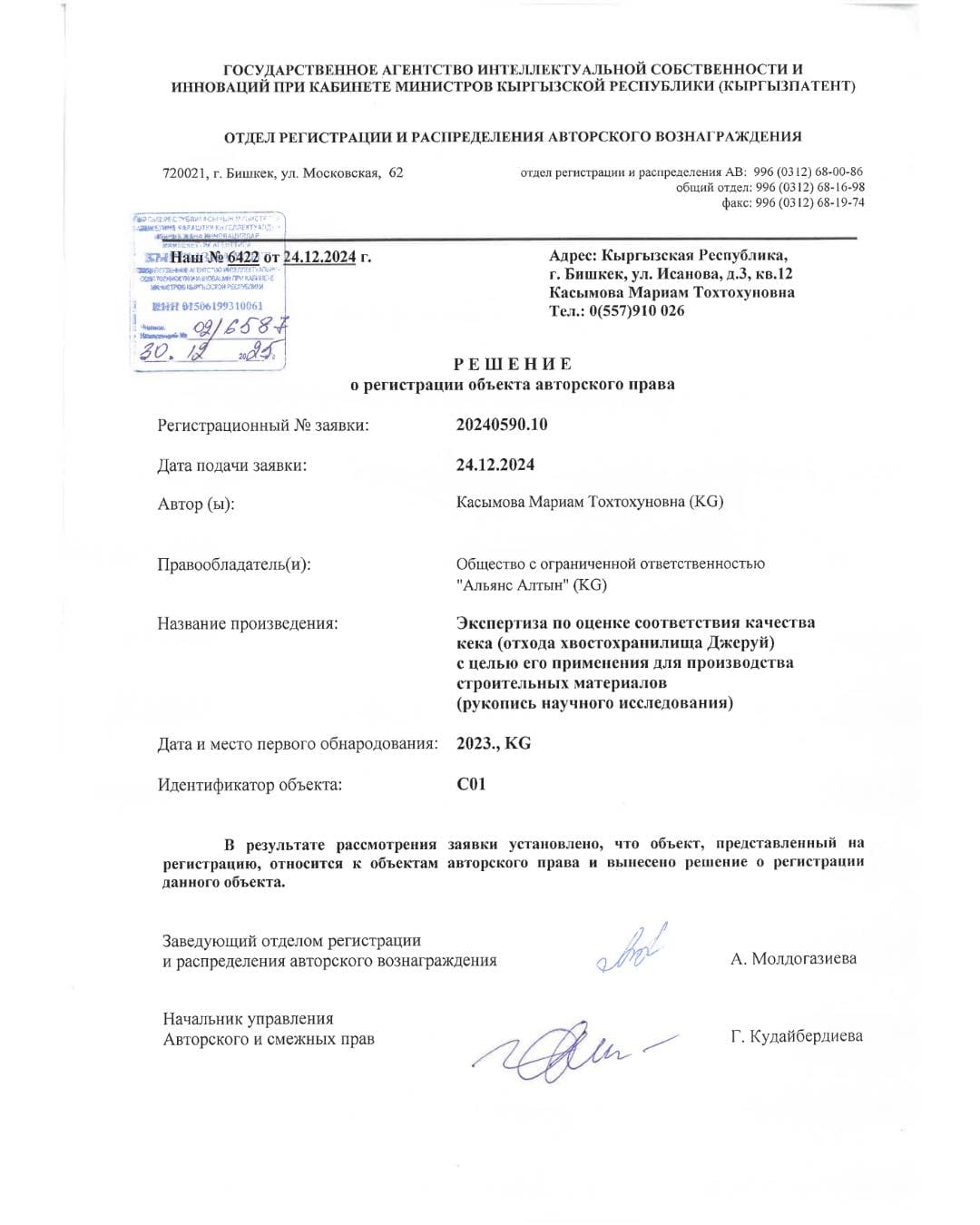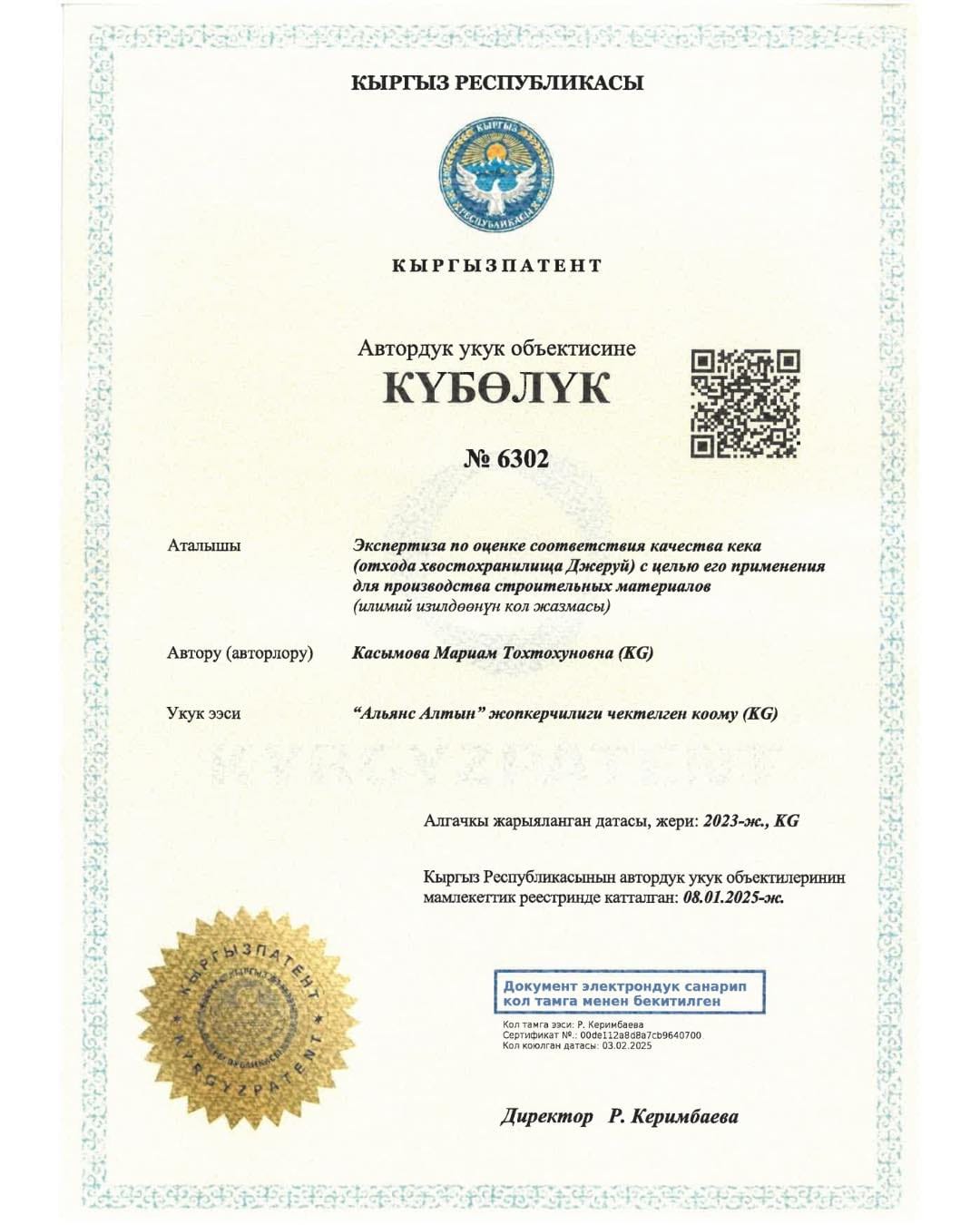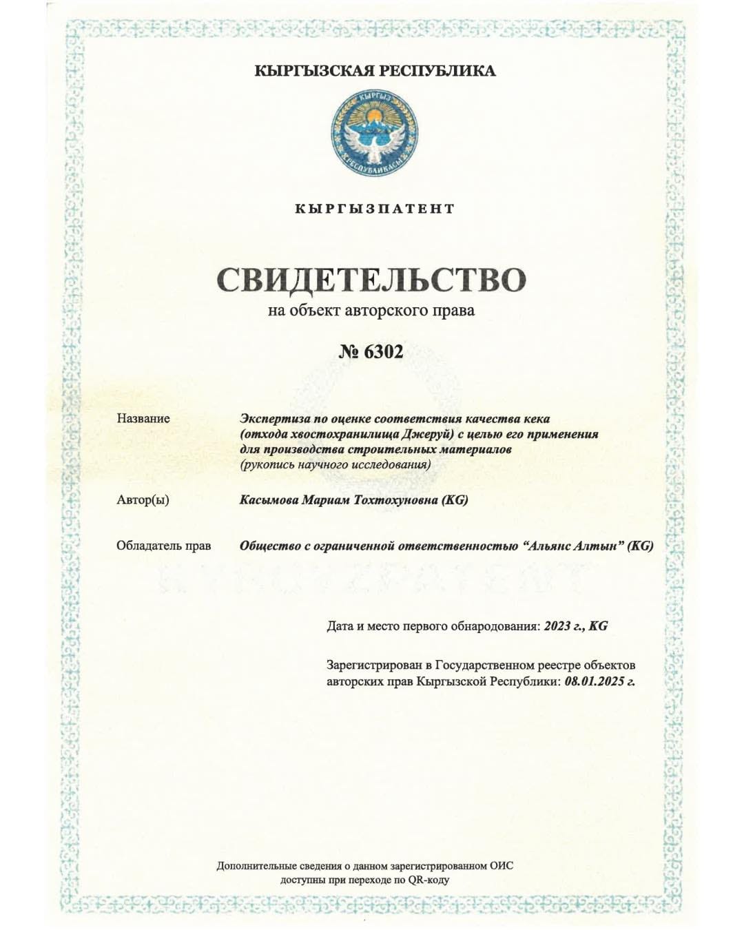 «Альянс Алтын» компаниясы Кыргызпатенттен алтын казуучу өндүрүштүнкалдыктары — кектерди курулуш тармагында кайра пайдалануу технологиясына автордук укук объектисин каттоо тууралуу күбөлүк алды. Бул тууралуу ишкана билдирди.