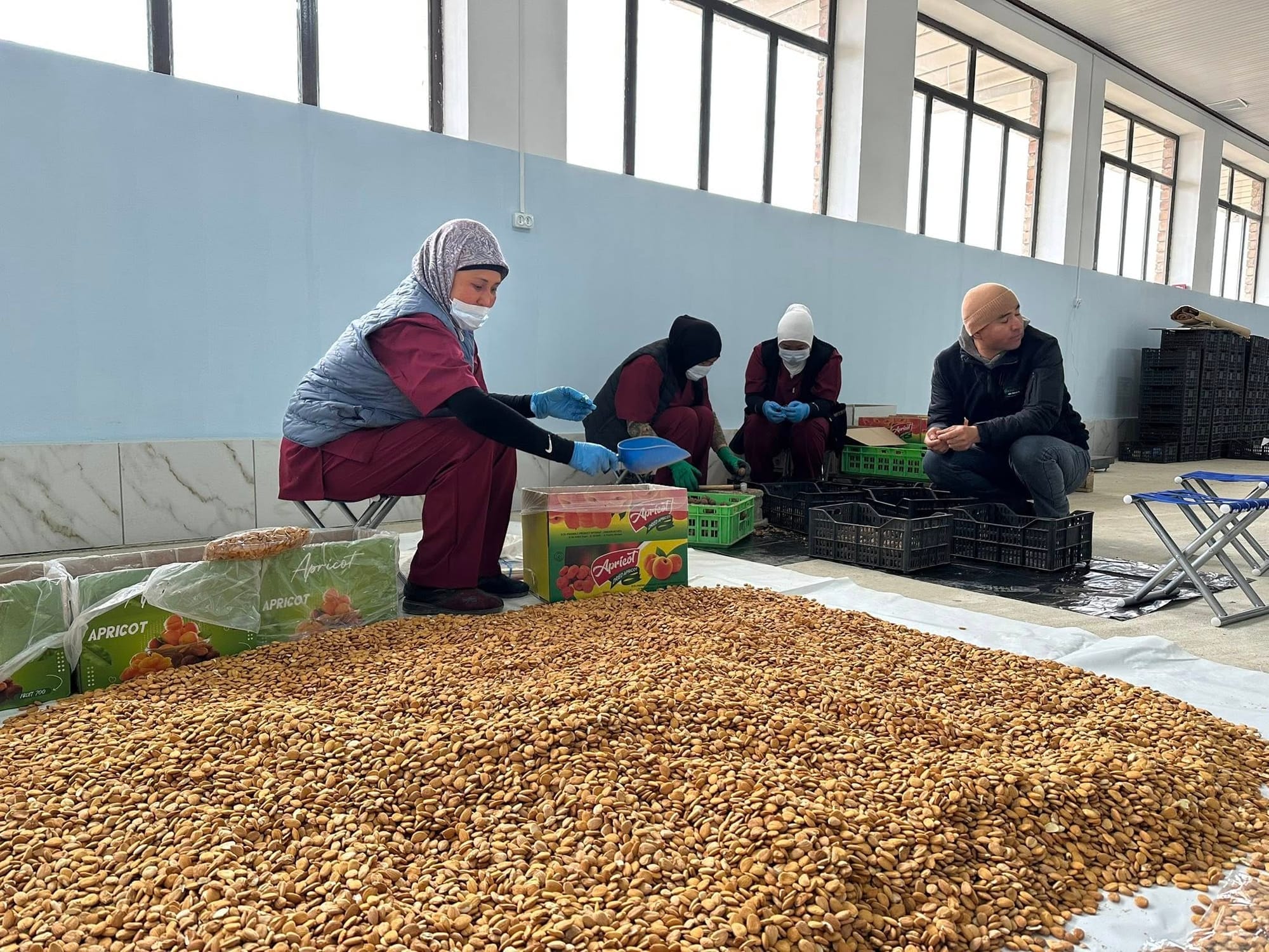 Фабрикада мөмөлөр жуулуп, атайын жабдуулар менен кургатылып, андан соң сатууга даярдалган пакеттерге салынат.