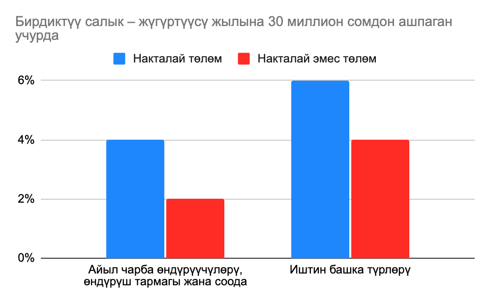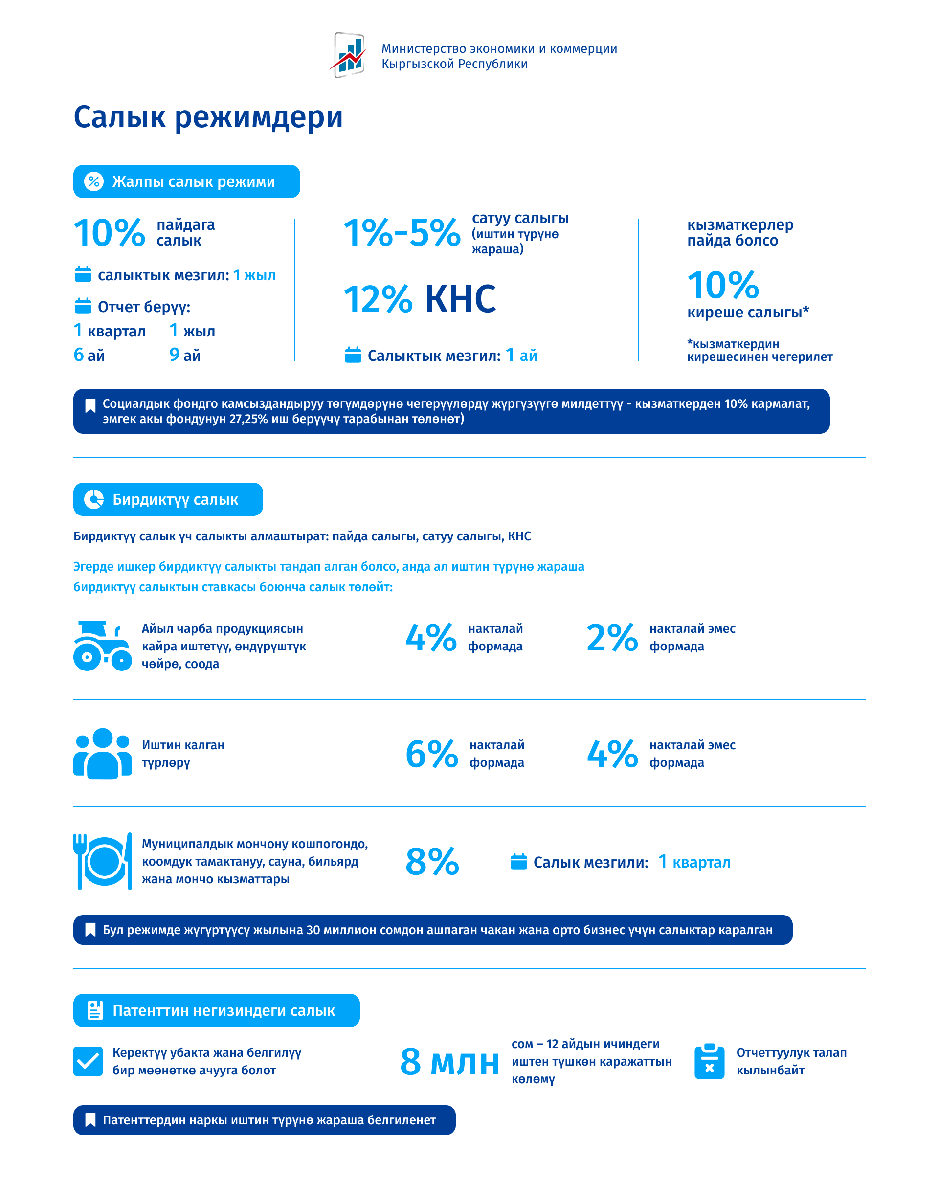 Эгерде ишкер КНС төлөөчү болгусу келбесе, бирдиктүү салыкка өтсө болот. Бул режимде жүгүртүүсү жылына 30 млн сомдон ашпаган чакан жана орто бизнес үчүн салыктар каралган.
