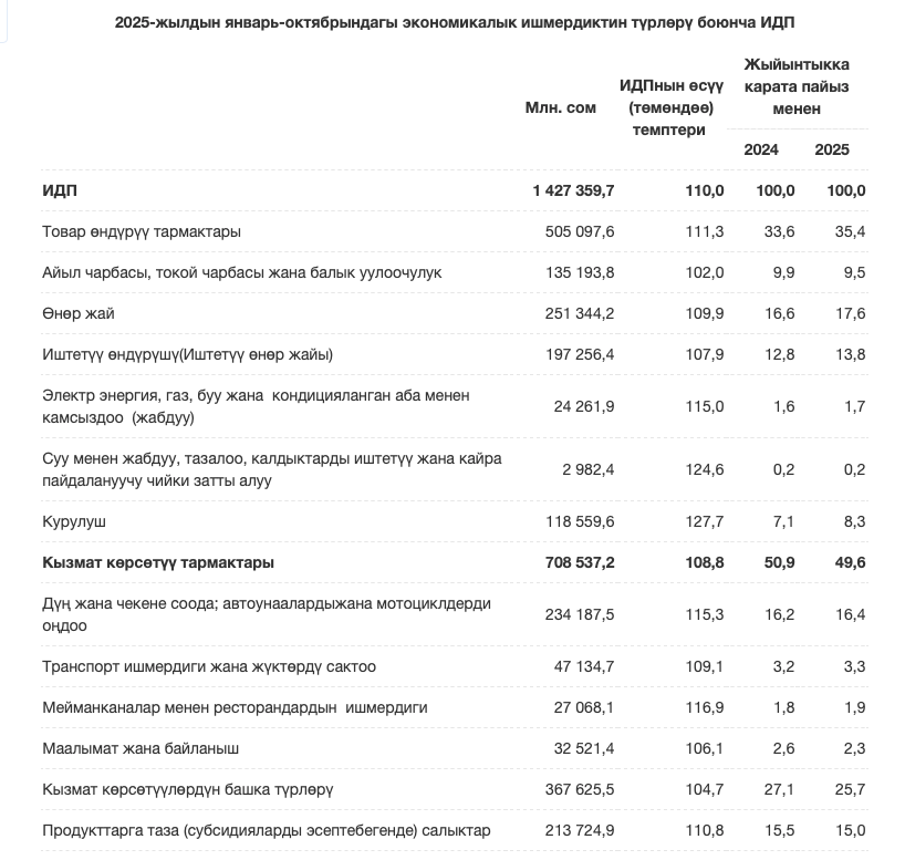 2025-жылдын январь-октябрь айларында Кыргызстандын ички дүң продукту (ИДП) мурунку жылдын ушул мезгилине салыштырмалуу 10,0%га жогорулап, 1 427,4 млрд сомду түздү. Бул тууралуу Улуттук статистикалык комитеттен билдиришти.
