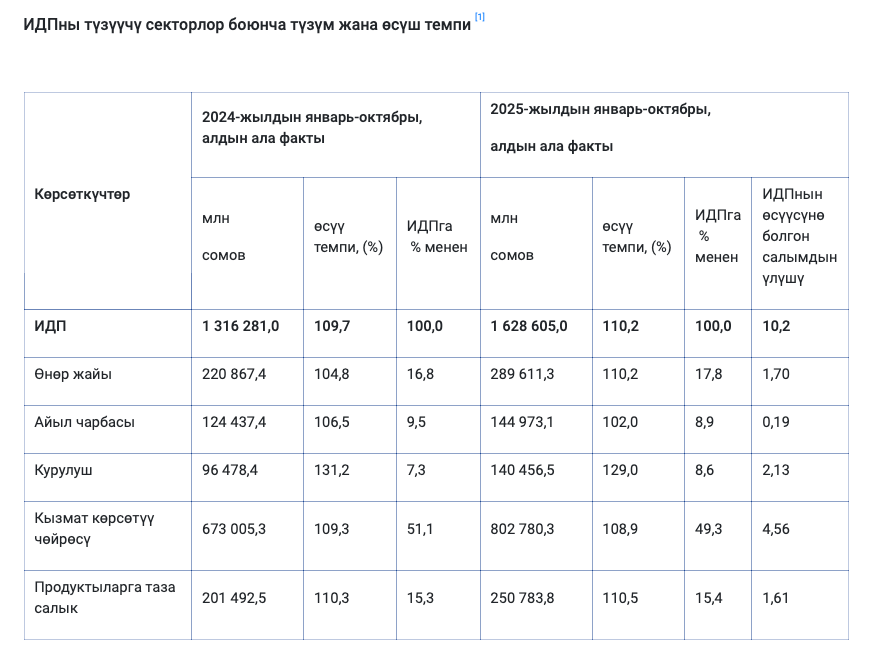 Улуттук статистика комитетинин алдын ала эсептөөлөрү боюнча, 2025-жылдын январь-ноябрь айларында ички дүң продукциянын (ИДП) көлөмү 1 628,6 млрд сомду түзүп, реалдуу өсүү темпи 110,2 % болду (2024-жылдын январь-ноябрында – 109,7 %).
