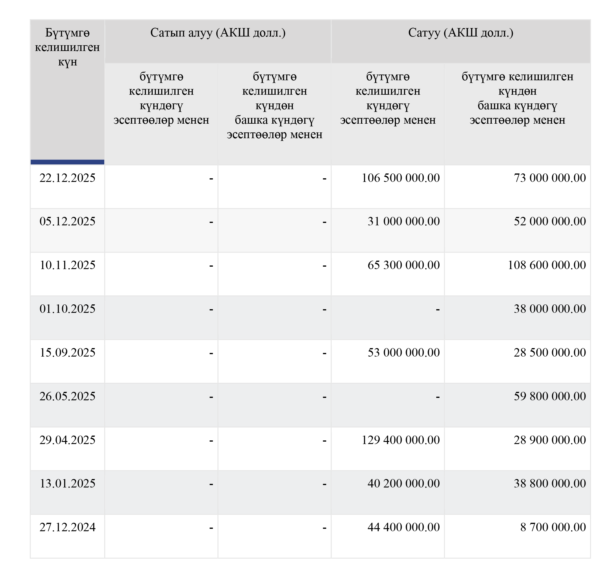 Билдирүүгө караганда, бул жолу Улуттук банк банктар аралык рынокто 179,5 млн АКШ долларын саткан. Белгилей кетсек, 8 интервенциянын бардыгы Улуттук банк тарабынан АКШ валютасын сатуу боюнча жүргүзүлгөн жана алардын эң ири сатуусу акыркы интервенция болуп эсептелет.