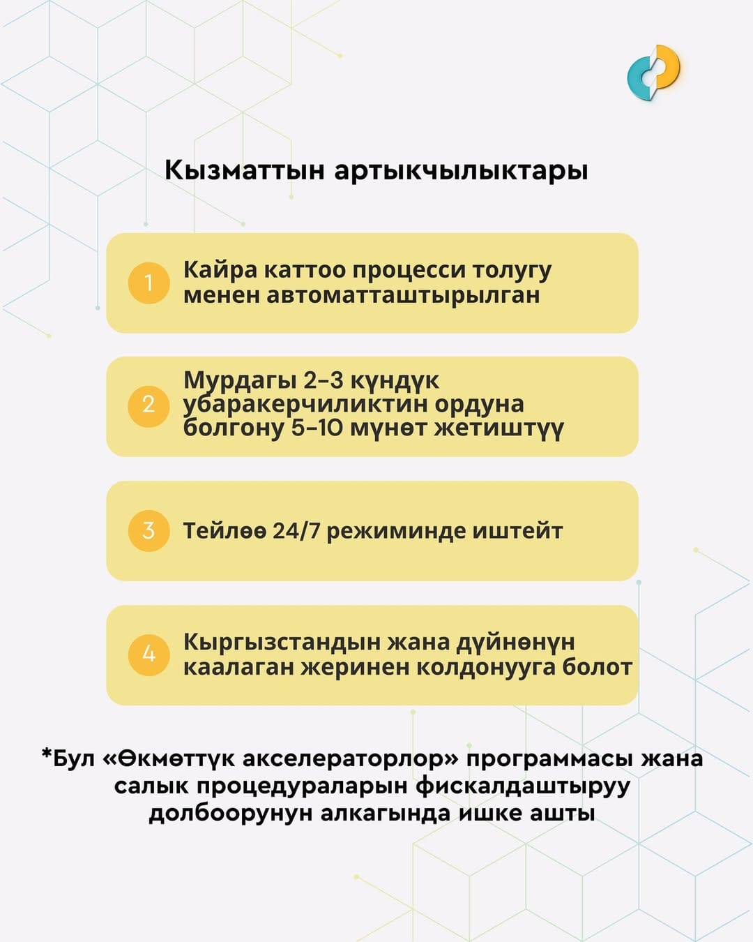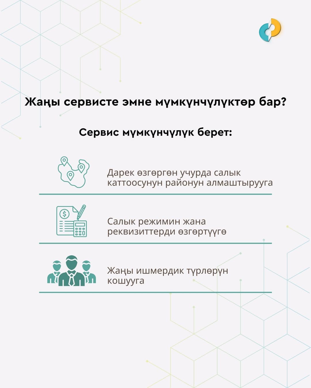 Төмөндөгү маалымдама аркылуу салык кызматы жаңы тейлөө кандай иштээри жана кандай мүмкүнчүлүктөрдү түзөөрү тууралуу кабардар болууну сунуштайт: