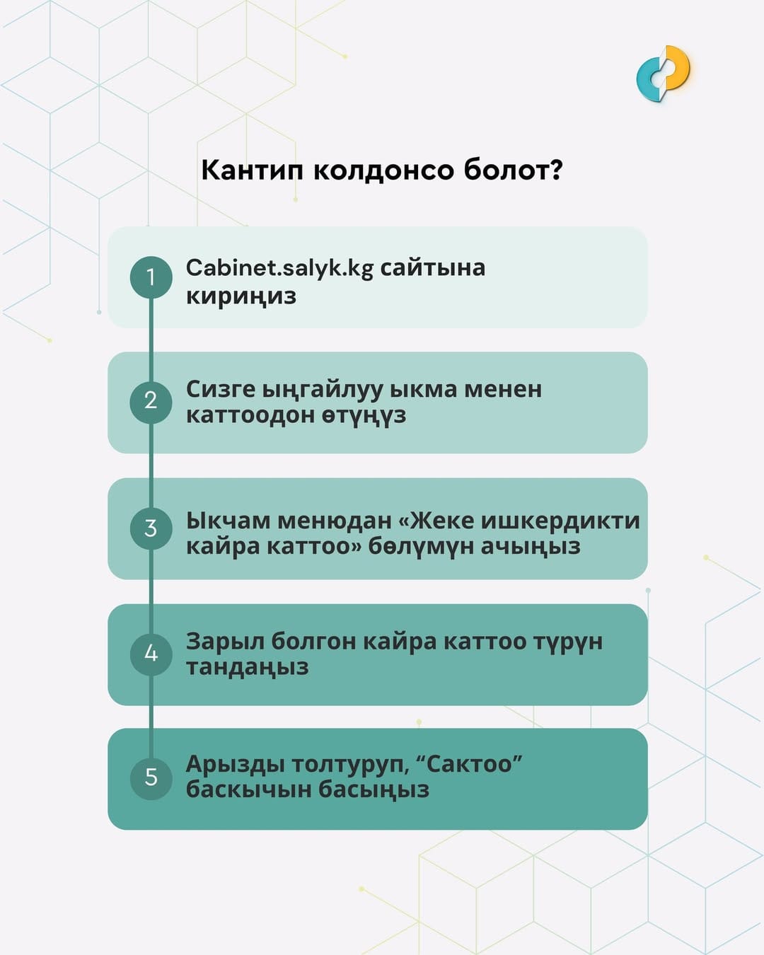 Ага ылайык, Салык кызматы ишкердикти кайра каттоо үчүн жаңы онлайн-сервис Cabinet.salyk.kg сайты аркылуу алыстан туруп эле, маалыматты жөнөтүүгө болоорун билдирүүдө.