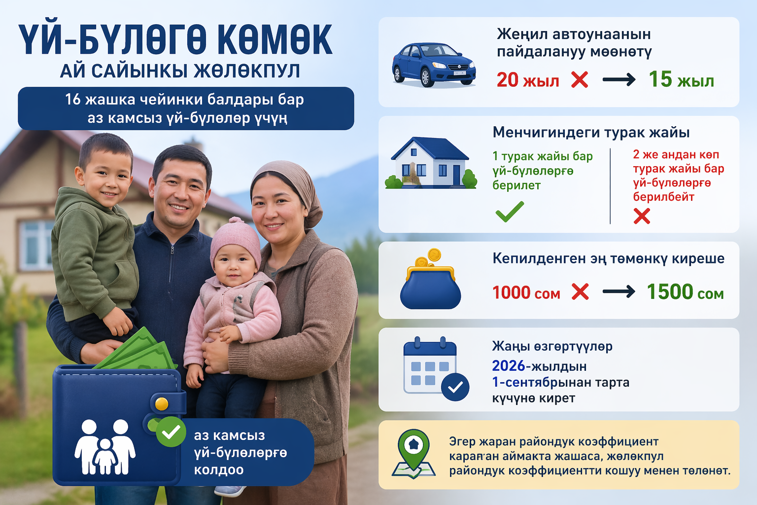 Белгилей кетсек, эгер жаран райондук коэффициент каралган аймакта жашаса, “үй-бүлөгө көмөк” жөлөкпулу райондук коэффициентти кошуу менен төлөнөт. Бул өзгөртүүлөр 2026-жылдын 1-сентябрынан тарта күчүнө кирет.