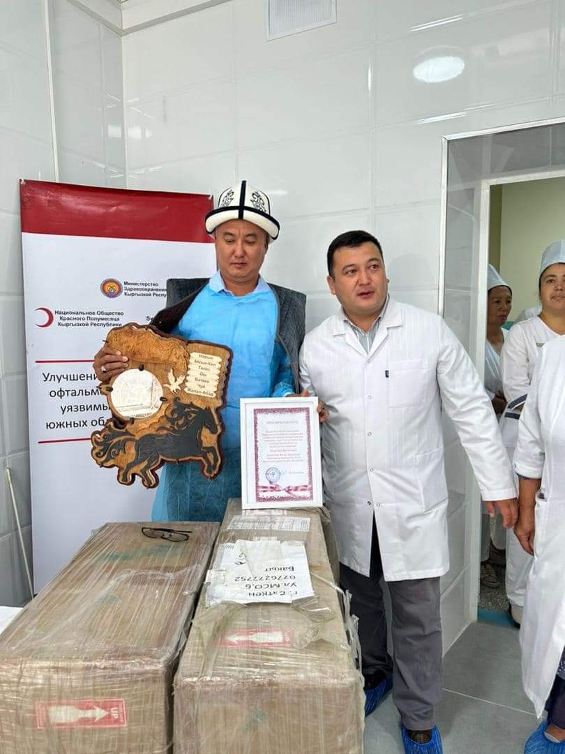 Маалыматка ылайык, кечээ Кыргызстандын Улуттук Кызыл Жарым Ай Коомунун Баткен облусундагы өкүлчүлүгүнүн директору Канатбек Жигитов жана көз оорулар боюнча координатору Бакытбек Давранов тарабынан 2 млн 120 миң сомдук операциялык микроскоп жана 45 миң сомдук стабилизатор көз оорулар бөлүмүнө белекке берилди.