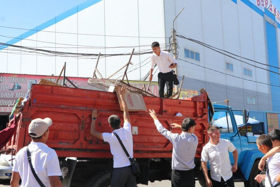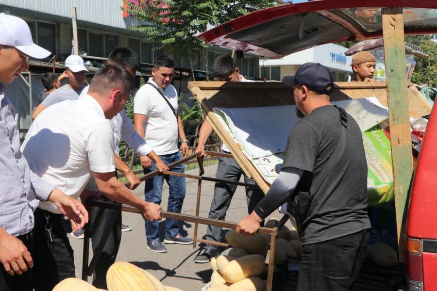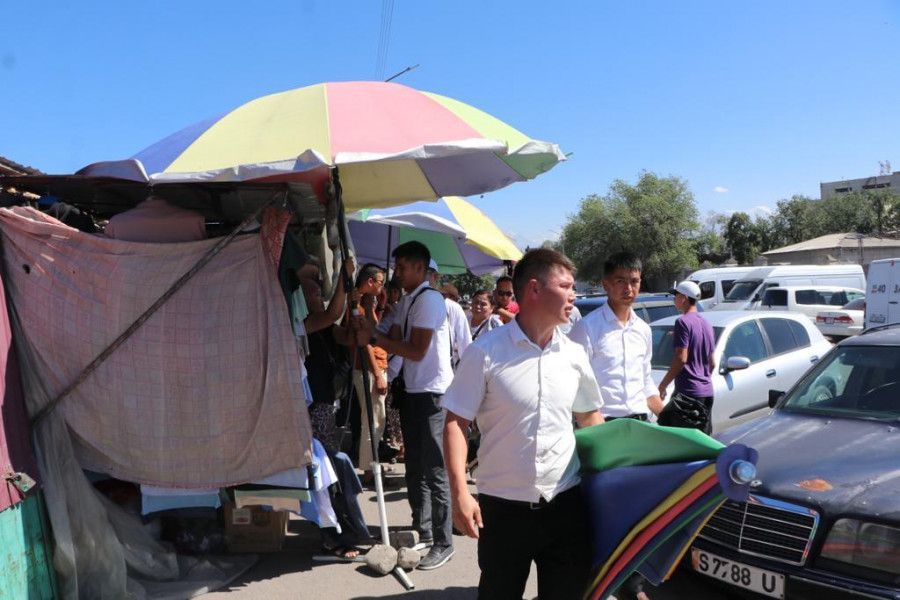 Ыкчам топ базардын чектеш көчөлөрүндө рейд жүргүзүп, 50гө жакын мыйзамсыз соода пункттарды жойду, 40тан ашык башаламан сооданын элементтерин: темир столдорду, отургучтарды, кол чатырларды жана таразаларды алып, кампага ташып жеткиришти.