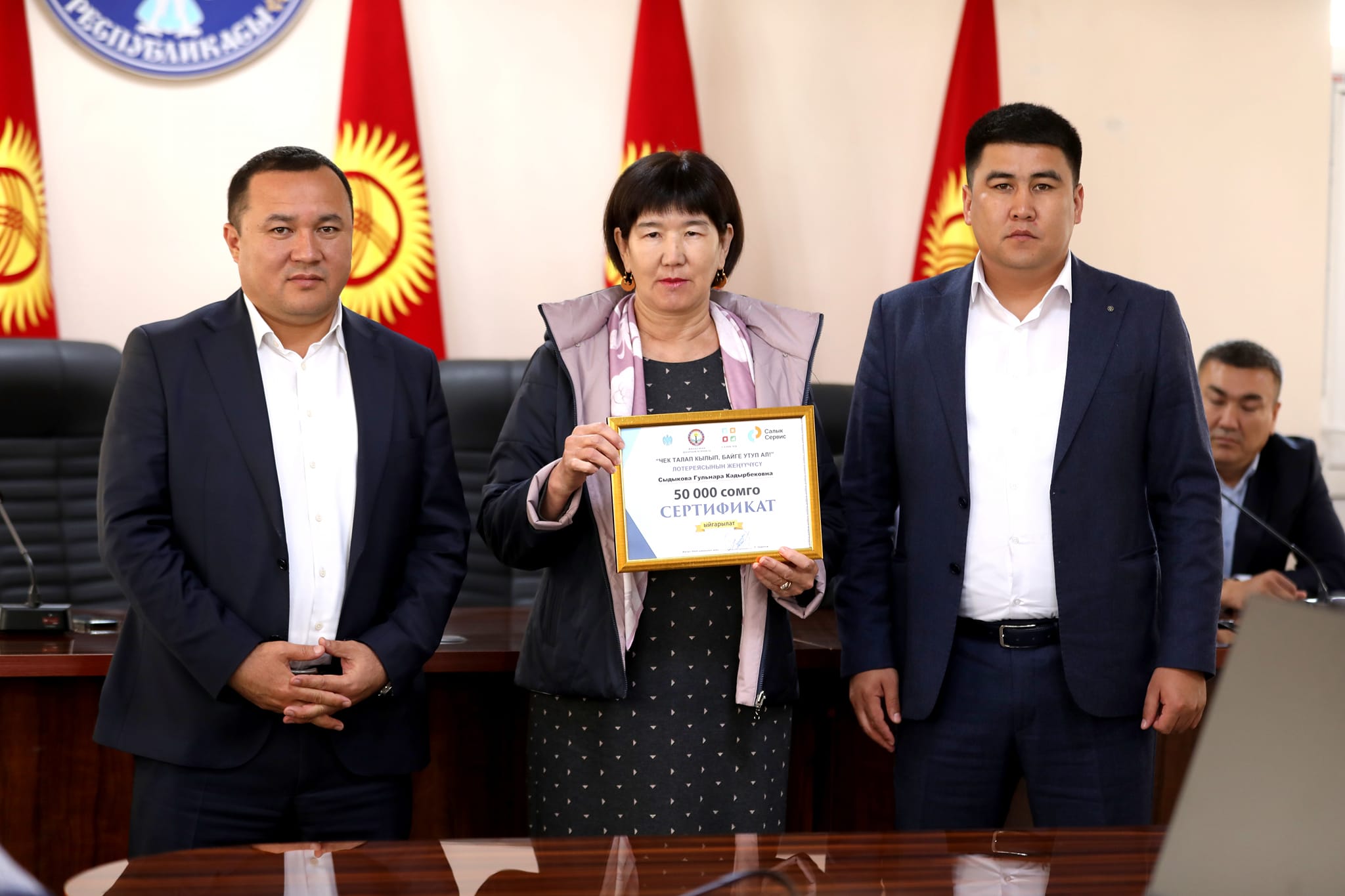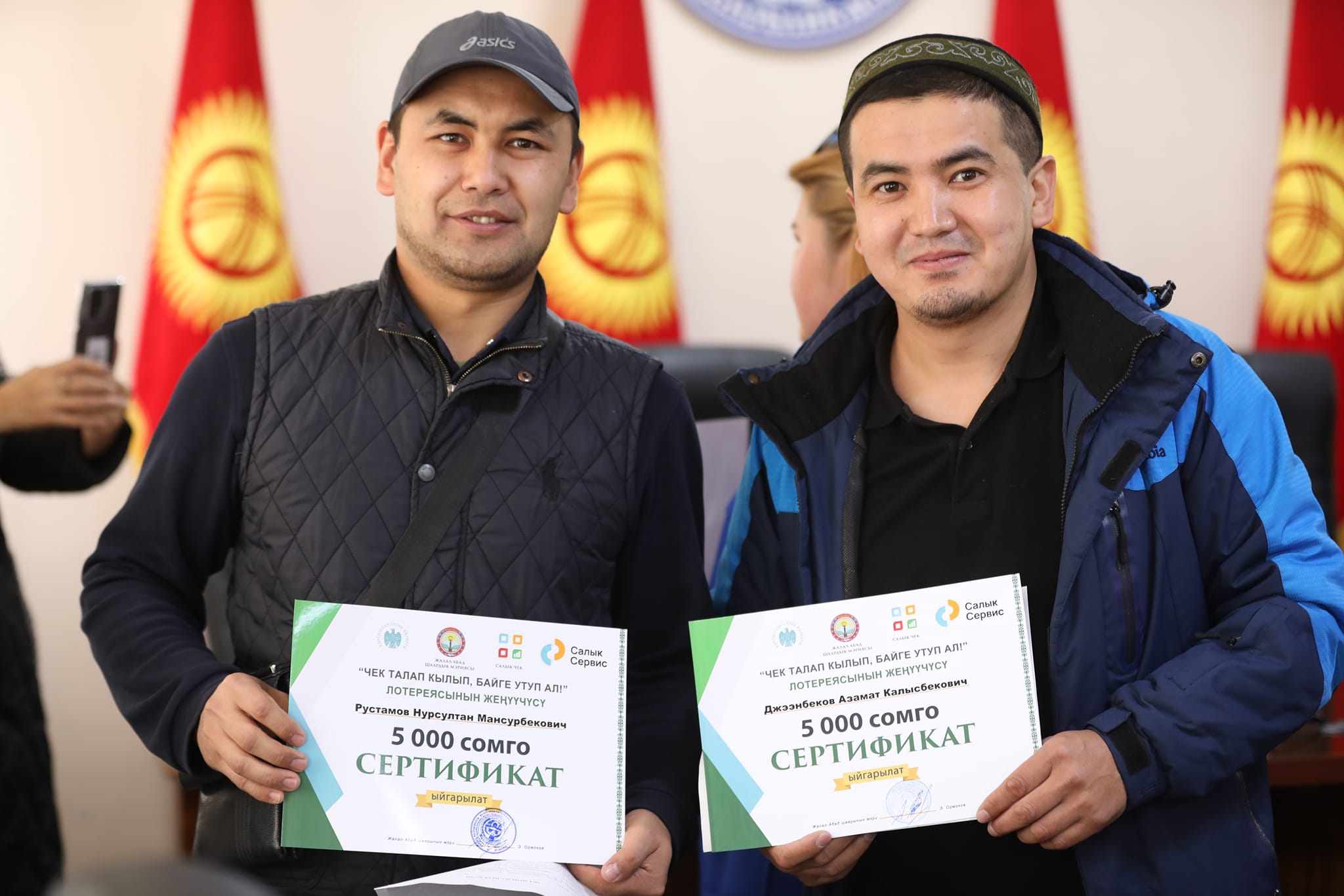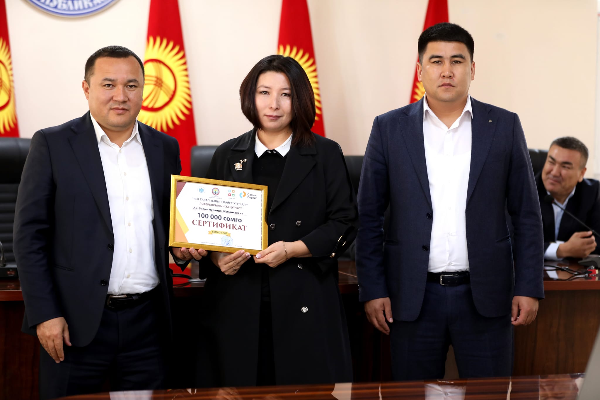 Жалал-Абадда “Чек талап кылып, байге утуп ал!” лотереясынын жеңүүчүлөрүнө сертификаттар тапшырылды