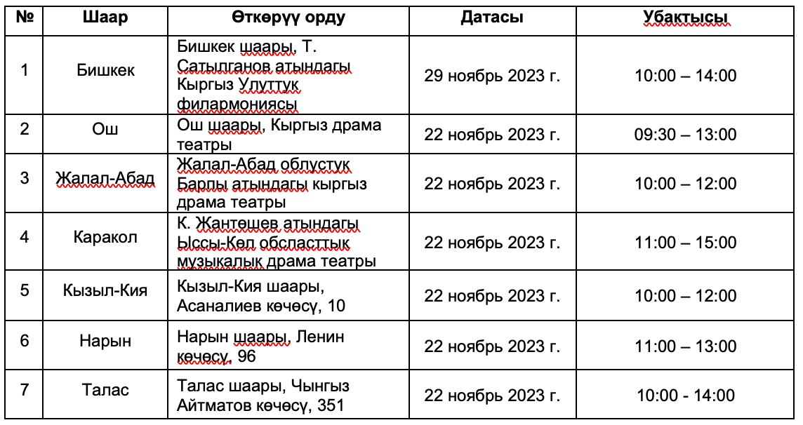 Бош иш орундар жана кесиптер Жарманкеси төмөнкү шаарларда акысыз өткөрүлөт: