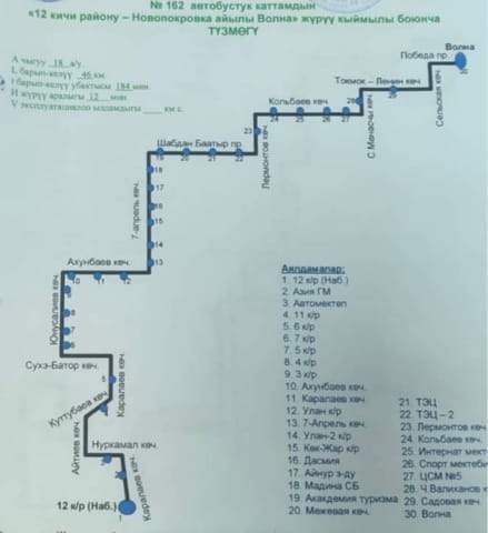 №162 автобус 12-кичи районунан Новопокровка айылына чейин каттайт. Узундугу 46 км, автобустардын аралыгы 10 мүнөт. Бул линияга 18 автобус чыгат.