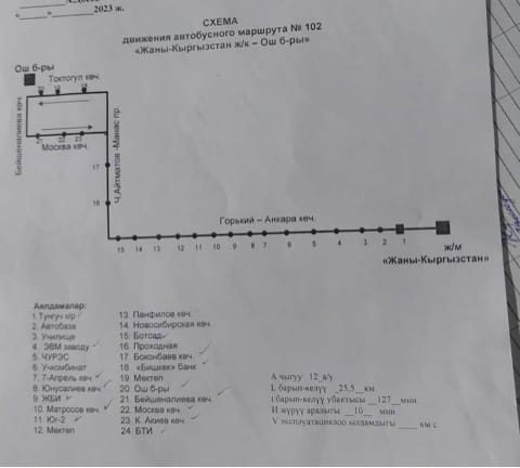 №102 автобус Рухий- Мурас жаңы конушунан Ош базарына чейин каттайт. Узундугу 25,5 км, автобустардын аралыгы 10 мүнөт. Бул каттамга 12 автобус чыгат.