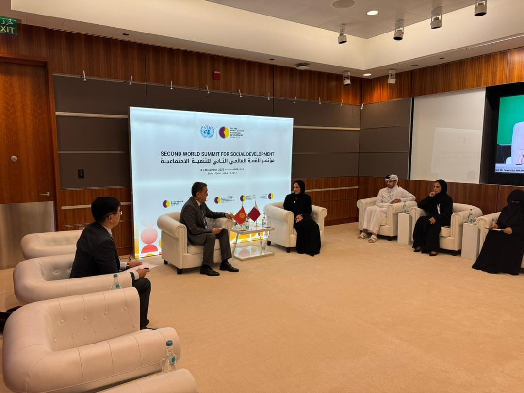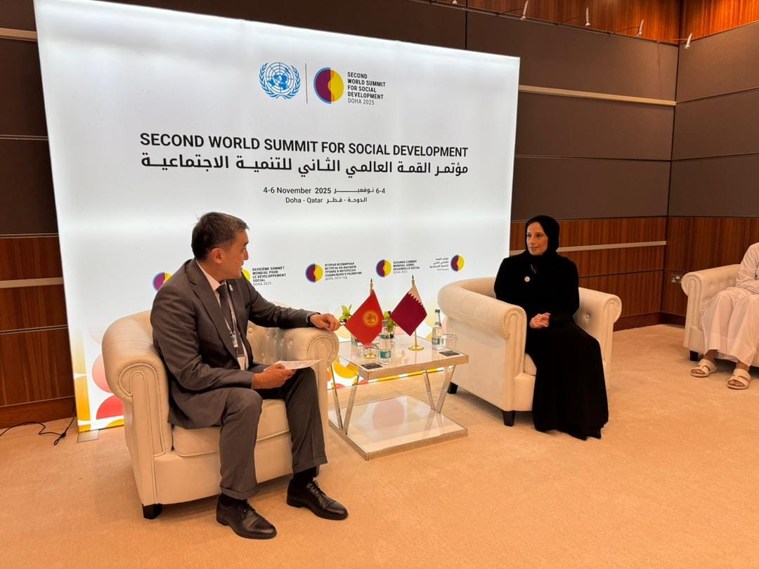 Доха шаарында (Катар) өтүп жаткан Экинчи дүйнөлүк социалдык өнүгүү саммитинин алкагында Эмгек, социалдык камсыздоо жана миграция министри Канат Сагынбаев Катардын Үй-бүлө жана социалдык өнүгүү министри Бутайна бинт Али Аль Жабр Аль Нуайми менен эки тараптуу жолугушуу өткөрдү. Бул тууралуу ведомстводон билдиришти.
