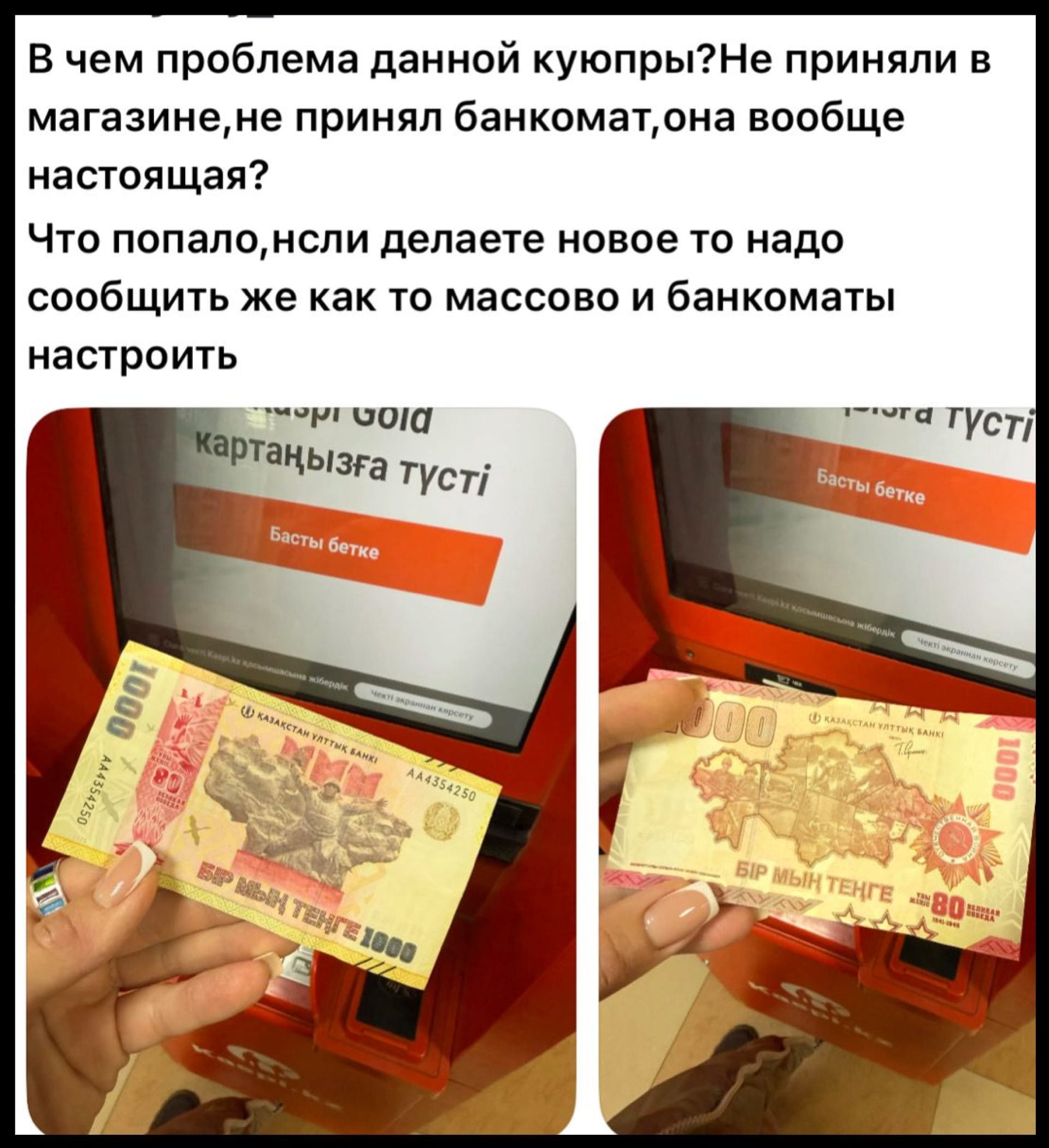 Казакстандык жаран социалдык тармактарда УАМС Жеңиш күнүнө арналган 1000 теңгелик эстелик банкнотун банкомат кабыл албай койгонуна нааразы болгон билдирүүсү жергиликтүү калктын кызуу талкуусуна айланды. Бул тууралуу tengrinews.kz билдирди. Билдирүүгө караганда, кардар жаңы банкнотту алгач дүкөндө, андан кийин популярдуу банктын банкоматында кабыл алынбай койгонун сындап жазган.