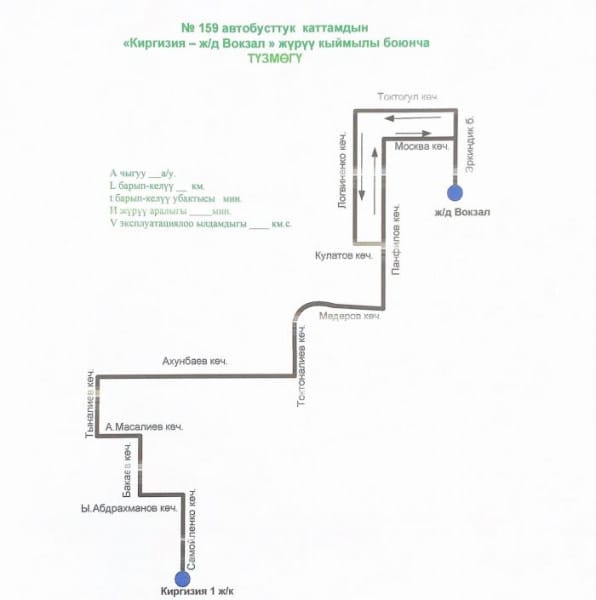 Маалыматка ылайык, №159 маршрут "Киргизия-1" конушунан темир жол бекетине чейин бекитилген маршруттук планга ылайык жүрөт.