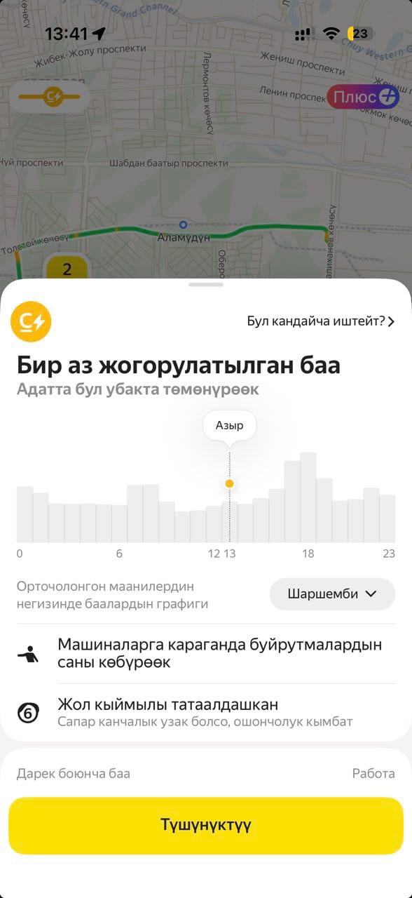Майрам күндөрү сервистеги тарифтер — 1 километр жана 1 мүнөткө эсептелген унаага отургузуунун баасы — өзгөрүүсүз калат, бирок суроо-талап жогорулаганда жол кире кымбатташы мүмкүн. Эгер жолго чыккысы келгендердин саны айдоочулардан көп болсо, жол кире адаттагыдан жогорулайт.