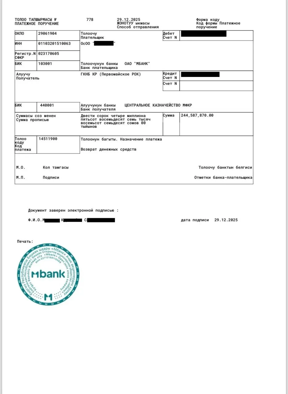 Финансы министрлигинин аудиттик текшерүүсүнүн натыйжасында мамлекетке келтирилген зыян 244 млн 587 миң 870 сомду түзгөнү аныкталган. Бул сумма козголгон кылмыш ишинин жана жүргүзүлгөн ыкчам тергөө иш-чараларынын алкагында толугу менен өндүрүлдү.