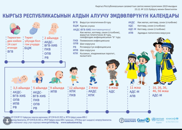 Анын айтымында, эмдөө календарына ылайык, жаңы төрөлгөн ымыркайлар төрөлгөндөн кийинки алгачкы 24 саат ичинде төрөт үйүндө эмделет, андан кийин бир жашка чейин баштапкы деңгээлде эмдөө жүргүзүлөт. "Төрөт үйлөрүндө эмдөө деңгээли 90%дан жогору. Жыл сайын 145 миң бала эмделет. Бирок ошол эле ата-энелер 2,5 айлык жана 5 айлык курагында эмдөөдөн баш тартып жатышат", — деди ал.