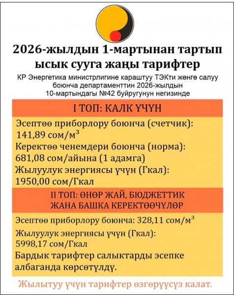 Ага ылайык, 2026-жылдын 1-мартынан тартып (салыктарды эсепке албаганда) ысык сууга жаңы тариф белгиленди. Ал эми жылуулукка болгон тариф өзгөрүүсүз калат. Жаңы тариф көрсөтүлгөн күндөн тартып ысык суу үчүн төлөмдөрдү эсептөөдө колдонула баштайт.