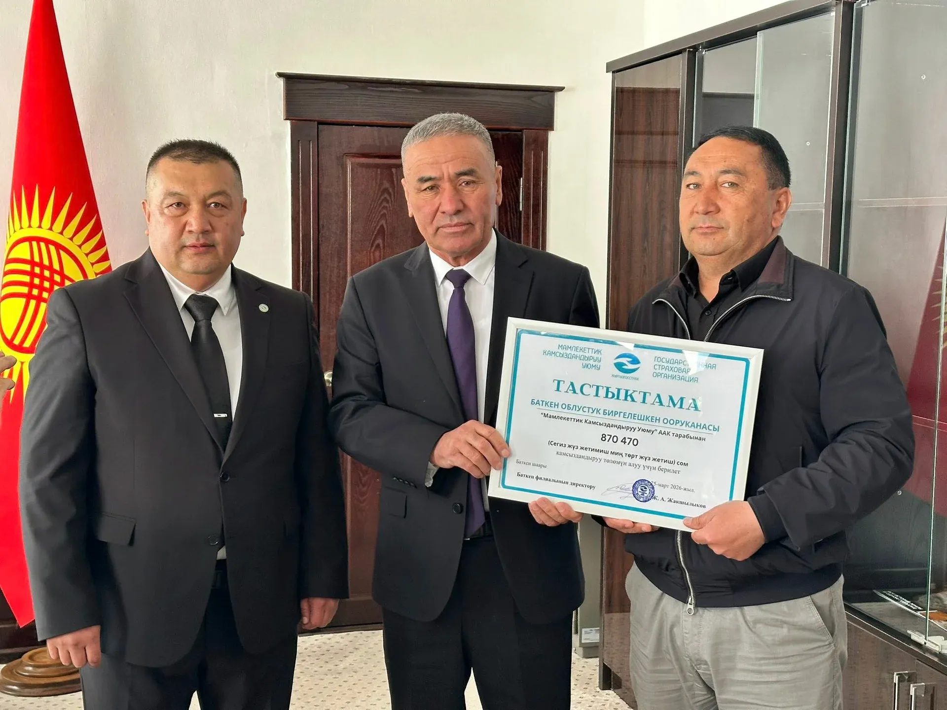 Президенттин Баткен облусундагы өкүлү Мамыржан Рахимов кырсыкка кабылган тургундарга жана мекемелерге Мамлекеттик камсыздандыруу уюмунун сертификаттарын тапшырды.