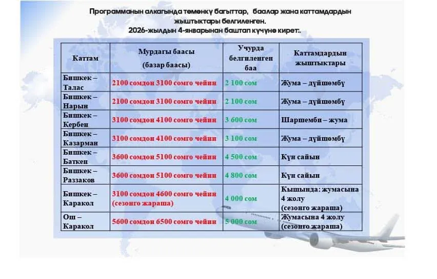 2026-жылга карата өлкө ичиндеги аймактарга болгон аба каттамдардын баалары Президент Садыр Жапаровдун тапшырмасына ылайык арзандатыларын президенттин басма сөз катчысы "Кабар" агенттигине Аскат Алагөзов билдирген.