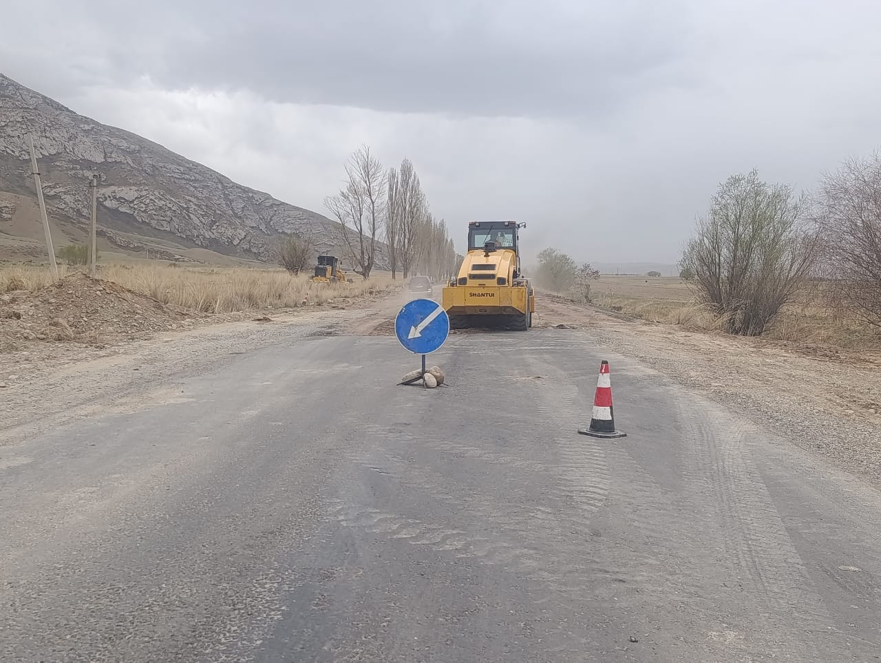 - 99-102 чакырымдын оң тарабына биринчи катмар асфальт басылууда.